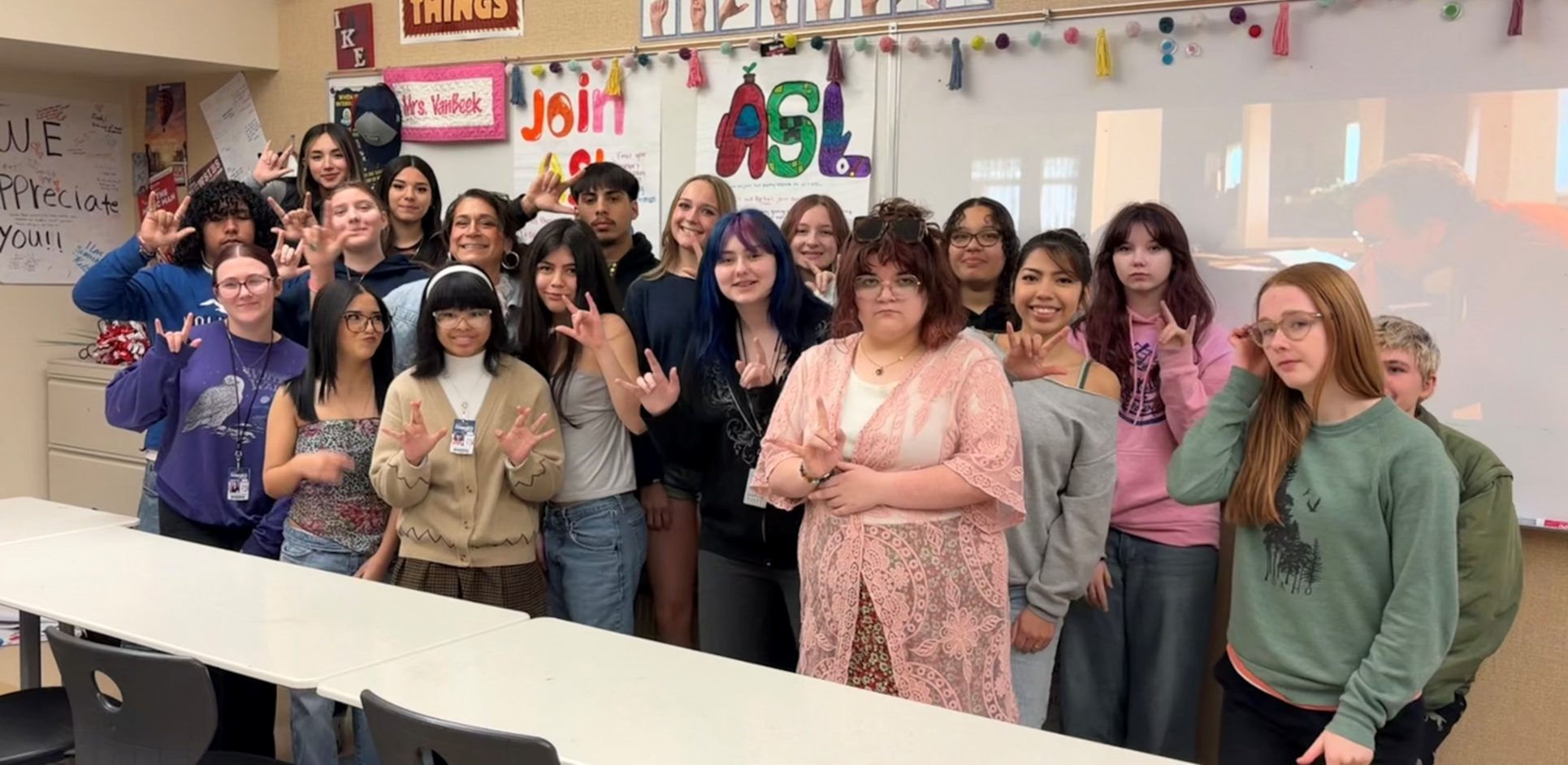 Mrs. Vanbeek is very passionate not only about the language itself, but also her students and their overall well-being on top of it all - “ASL is a culture-driven language, along with the classroom of how I teach, I think it’s important that we protect it [ASL] because it gives the kids confidence. At the beginning, they either refuse or just struggle to present and get in front of their peers. By about the middle of their first and second years, my kids started volunteering to go. When my students get comfortable in their own skin, it makes me want to have more and more classes like this.” She also states that yes all of your other classes are important, “but students who are put in front of a screen 24/7 don’t know how to have that interaction with the human face to face - it is amazing to see them go from absolute screenagers for the first couple weeks, to a couple months later now to the point where now they come in five minutes before the bell and I don’t see phones. The relationships that build are what we need more of - which is why I am hopeful this program can continue.”